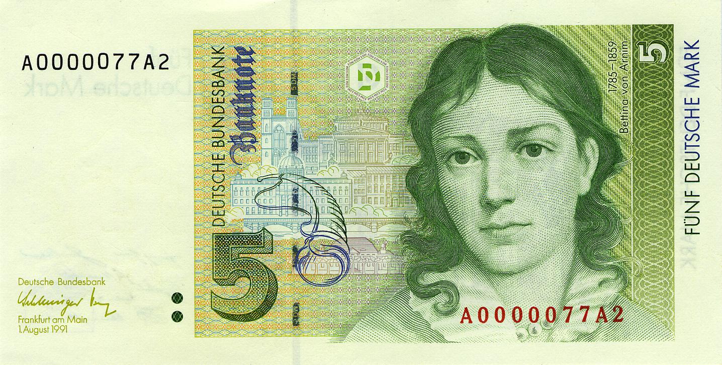 | 5马克 | 2.56 | 122 × 62 mm | 黄绿色 | 贝蒂娜·冯·阿尔尼姆、维佩尔斯多夫庄园与柏林历史建筑、号角(象征少年魔法号角) | 勃兰登堡门、贝蒂娜·冯·阿尼姆寄给歌德的信件手稿 | 与肖像相同 | 1991年8月1日 | 1992年10月27日 | 2001年12月31日 | 未定 | ||