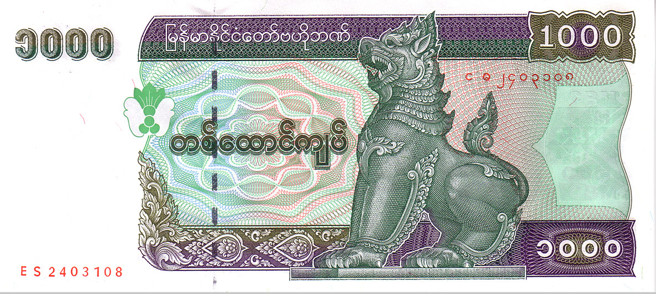 | [3] (页面存档备份,存于互联网档案馆) | 1 kyat | 钦特, "缅甸中央银行" 用 缅文 | 银行名称及面额使用英语和阿拉伯数字 | 1999 | ||||