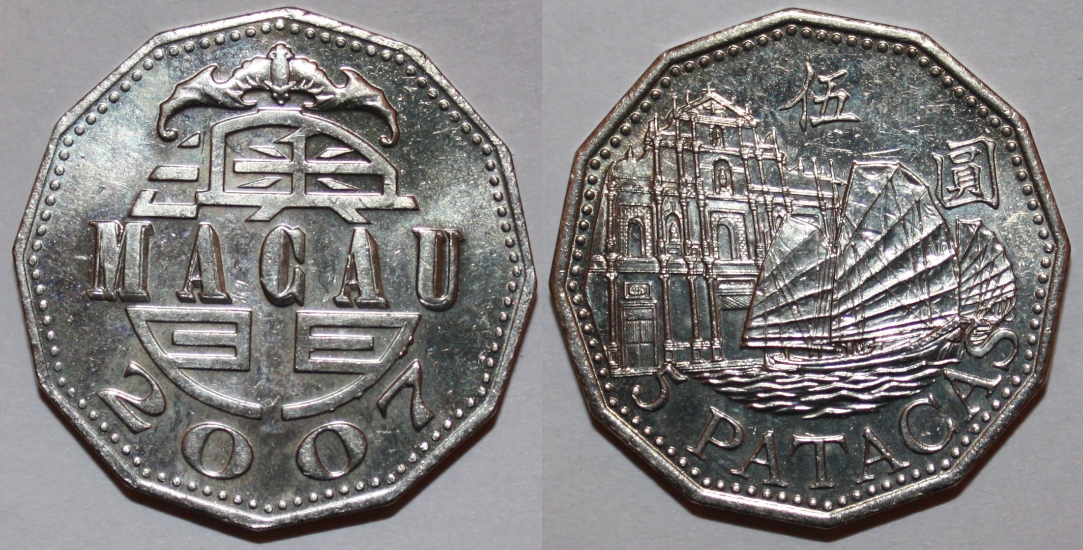 | 伍圆 ($5) | 白镍合金 | 十二边形 | 大三巴牌坊 中国帆船 |