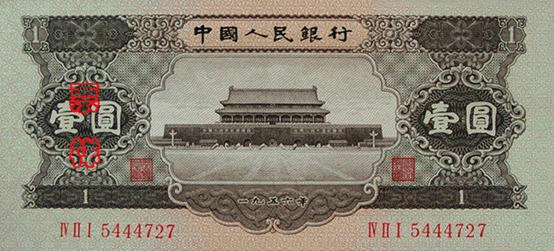 | 1元 | 双面皆为凹印图面配胶印底纹,正面为天安门图,红色调;背面图案为国徽及“中国人民银行壹圆”的汉蒙藏维四种文字,红色调;空心五角星水印。冠号为三字冠、七号码。该币于1955年3月1日发行。1969年10月20日只收不付。1999年1月1日停止流通。票幅尺寸为150 × 67.5 毫米(5.91 × 2.66 吋)。 | |