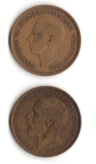 乔治五世硬币在1922年之前,与以前的硬币使用同样的合金。1923年,尽管保持了1⁄3盎司(9.4克)的重量以及1.2英寸(31毫米)的直径,铜币的成分调整为95.5%的铜,3%的锡和1.5%的锌。新的合金的可塑性稍强,所需的打造力度减少,因而可以有效减少重影。1923年、1924年和1925年都没有铸造新币,[14]这是由于战争期间,硬币的过剩和短缺交替出现,[15]导致需求不足。1928年,国王肖像的尺寸缩小,从而有效地消除了重影问题。[16]硬币正面的左侧半身像有三种不同图案,而周围的铭文仍然是“蒙上帝之恩,乔治五世,不列颠之王,信仰之卫士,印度之君王”。硬币背面和过去一样,依旧是不列颠尼亚女神形象,只不过其设计在1922年稍经改动。[17]