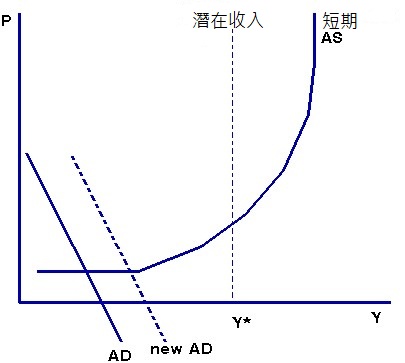 超越Y*,那会变得更极端,总需求变动会完全化为物价变动。更坏的是,超于Y*的产出水平不能长久维持。这里AS曲线只反映一个短期关系,如果经济仍在潜在产出之上运作,AS曲线会向左移,令到原有实质产出的上升消失。
