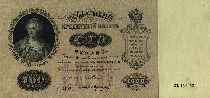 俄国从19世纪初开始发行纸币,到1897年实行金本位制之前,俄国卢布纸币随年份的不同,有很多的种类,主要面额有1卢布、3卢布、5卢布、10卢布、25卢布、50卢布和100卢布七种,票面上均印有双头鹰国徽,部分票面上印有沙皇肖像。该类纸币曾少量流人中国。1897年,俄国实行金本位制,确定卢布纸币与金卢布铸币的比价为1.5:1。同年订立纸币发行条例,由国家银行发行纸币,在俄国境内强制通用,主要面额有1卢布、3卢布、5卢布、10卢布、25卢布、50卢布、100卢布和500卢布八种。该类纸币曾大量流入中国东北地区[1]。